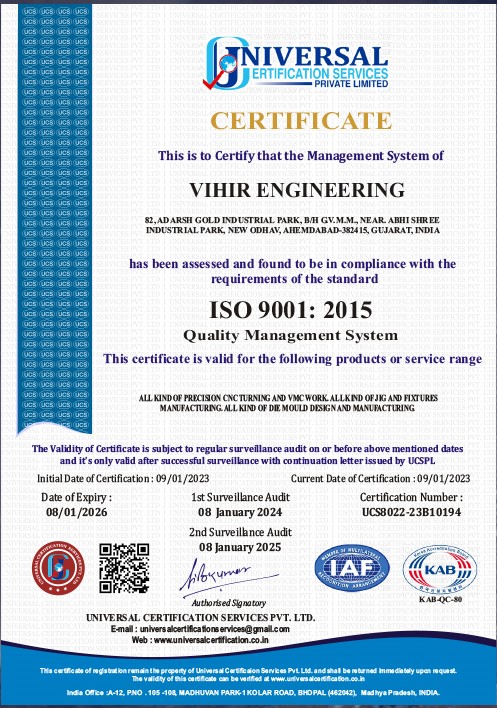 As a leading ISO 9001:2015 certified manufacturer of machinery parts and service provider of CNC & VMC Job Work, Precision Job Work, 4th Axis Job Work, and other machining services, Vihir Engineering was founded in Ahmedabad (Gujarat, India) in 2021. Since we were established as a sole proprietorship company, we have strived to provide these services as per client requirements in an efficient manner. We are backed by a team of highly qualified and experienced professionals who are well-versed in their respective areas of operation. Our professionals work in sync with customers to understand their exact requirements and provide them with the most suitable possible solutions.